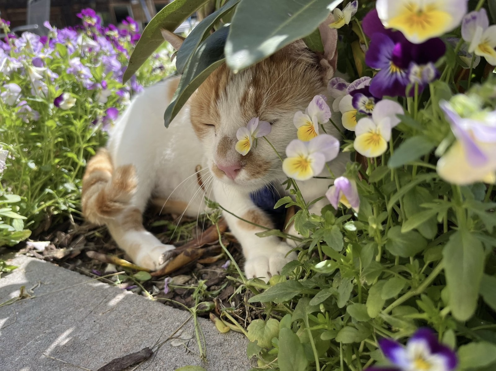 Im Garten, zwischen frischem Gras, unter ersten Blüten.